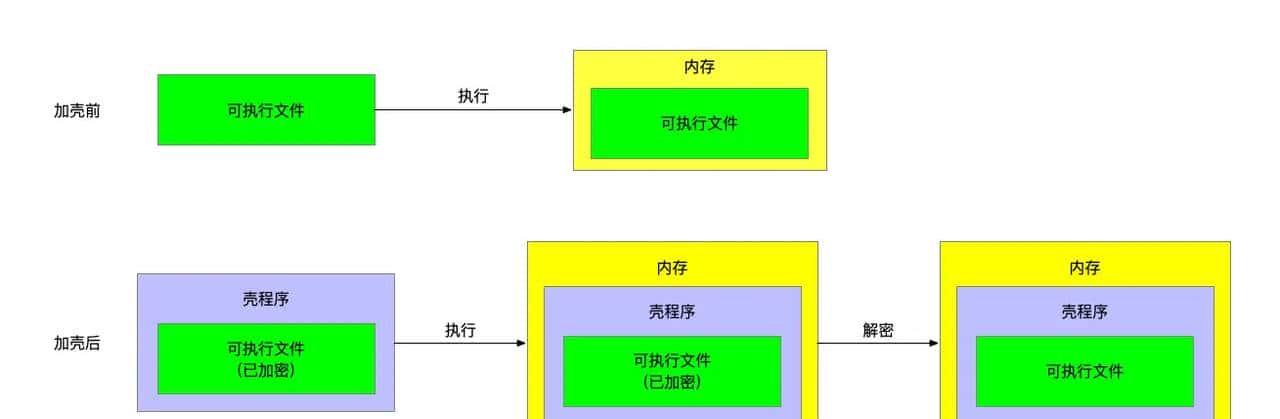 - 加壳之后,会在可执行文件上包装一层壳程序,执行时会将包装壳程序的可执行文件加载进入内存,然后进行解密操作,最终得到可执行文件,然后运行;