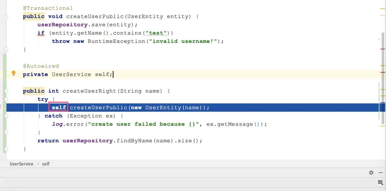 Spring通过AOP技术对方法进行增强,要调用增强过的方法必然是调用代理后的对象。我们尝试修改下UserService的代码,注入一个self,然后再通过self实例调用标记有@Transactional注解的createUserPublic方法。设置断点可以看到,self是由Spring通过CGLIB方式增强过的类: