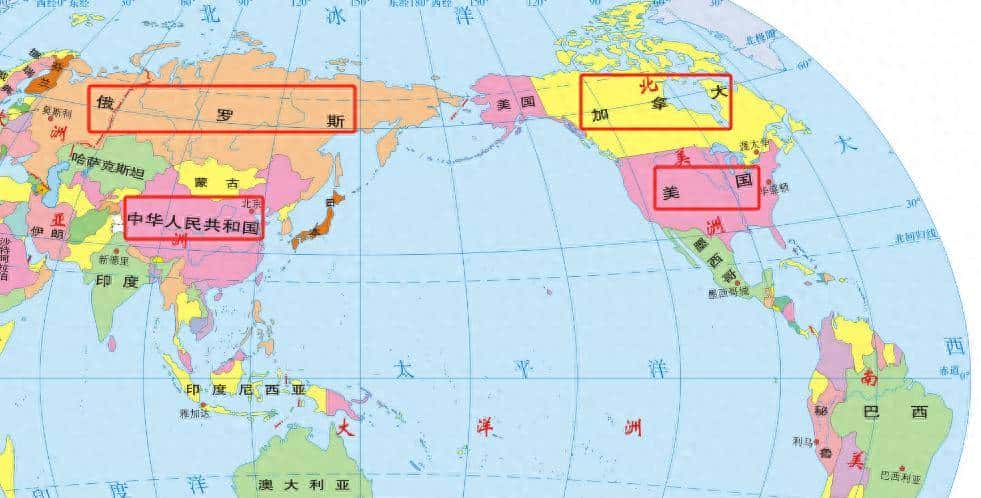 世界上面积最大的4个国家:俄罗斯、加拿大、中国、美国。其中三个既是陆地大国,也是海洋大国,版图横贯所在的大陆,拥有几个方向的海岸线。