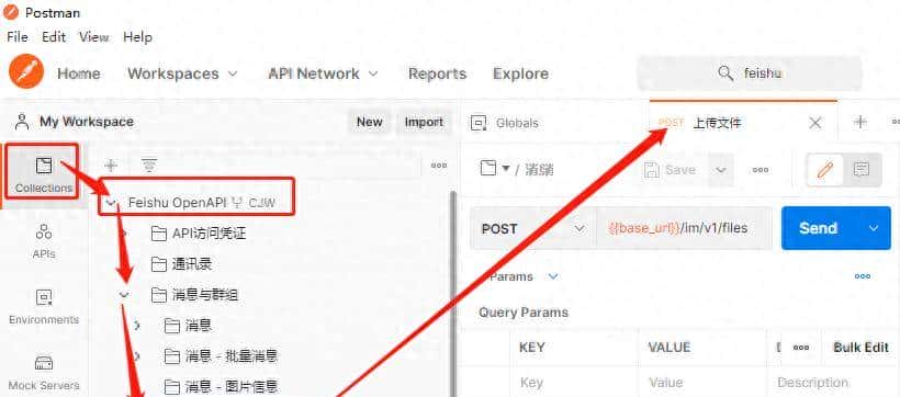 尝试了网络版的Postman,连不上,于是下载了Postman,在Postman的collection中搜索feishu,搜到了飞书的collection,克隆(Fork Collection)到本地,就可以使用了。