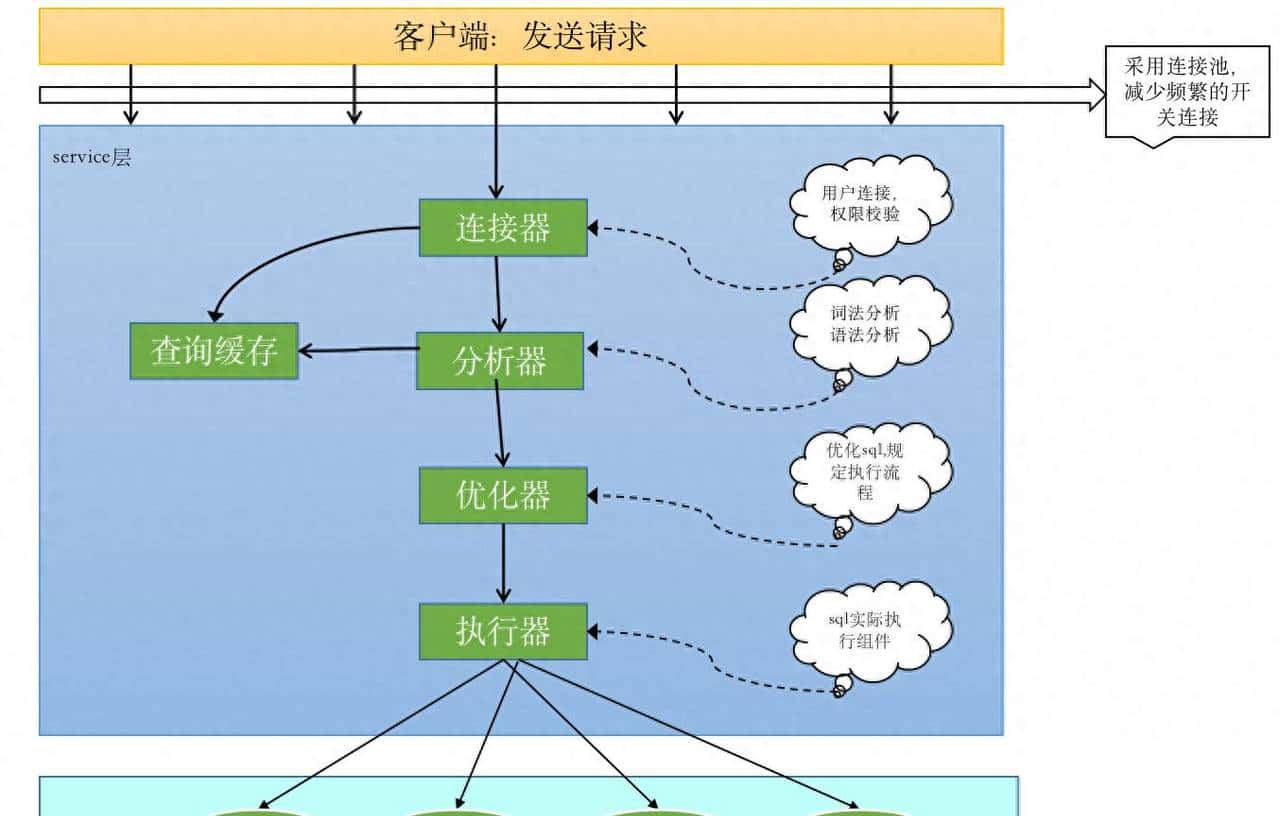 service层包含了mysql大多数核心功能,除了图中标注的连接器,查询缓存,分析器,优化器,执行器,还有所有的内置函数(日期,时间,数学和加密函数),所有跨存储引擎的功能都在这一层实现:存储过程、触发器、视图等。