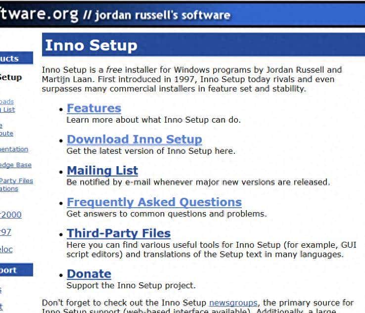 而为了更方便,我们这里会介绍如何将该目录打包为安装文件,这样在给别人用的时候,只需要给一个安装文件。用户拿到该安装文件后,安装上之后就可以使用了,且使用感受更好。我们这里介绍一个将目录打包为安装文件的工具程序。该工具程序名为Inno Setup,是一个免费的工具软件,网站主页如下图11-1所示。可以点击Download Inno Setup链接进行下载,详细信息可以登陆网站()进行了解。