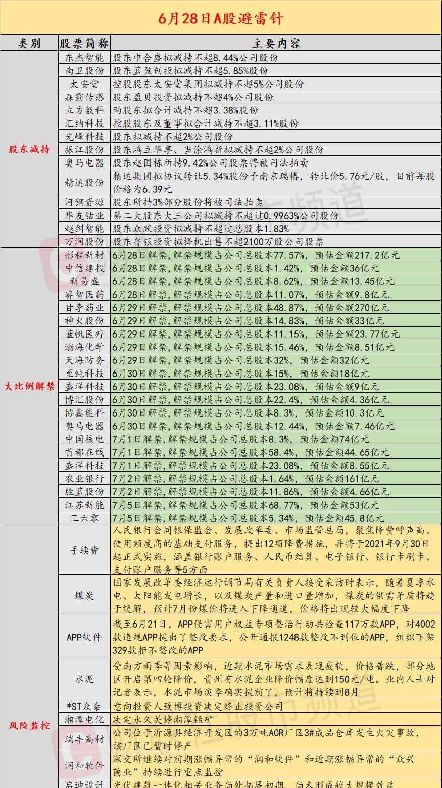 导读:1、东杰智能将迎来超8%的大比例减持;2、央行、银保监会、发改委、市场监管总局联合推出进一步降低支付手续费等措施;3、意向投资人致博投资决定终止投资*ST众泰;4、发改委预计7月份煤价将进入下降通道,价格将出现较大幅度下降;5、美国西北部地区遭遇历史最高纪录高温天气;6、欧洲央行将系统性投资公司纳入监管。