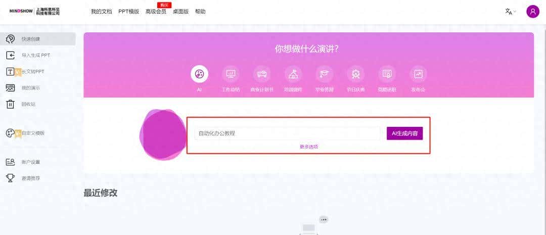 使用方式:注册——输入PPT主题——AI自动生成内容——修改内容——自动生成PPT【可自选模板】