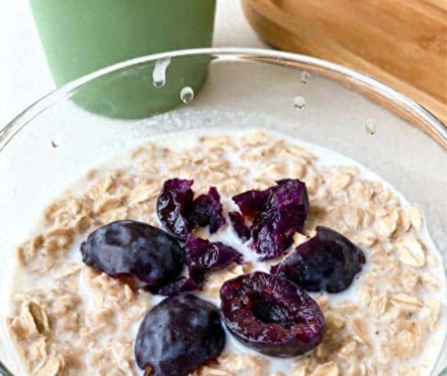升级做法:即食燕麦先用40℃温牛奶泡5 min,再撒两袋BB-12+LA-5复合益生菌粉,最后铺西梅丁。