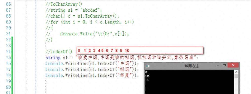 IndexOf() 查找某字符或字符串在要查找字符串中第一次出现的下标,与数组一样从零开始,如果没有找到对应的数据,则返回-1