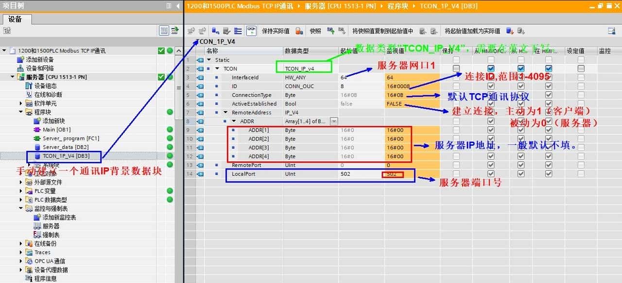 在“程序块”里添加一个名为“TCON_IP_V4”的数据块,这里无需撤销“访问优化块”。在静态变量“Static”里添加数据名称为“TCON”,数据类型“TCON_IP_V4”的通讯数据。