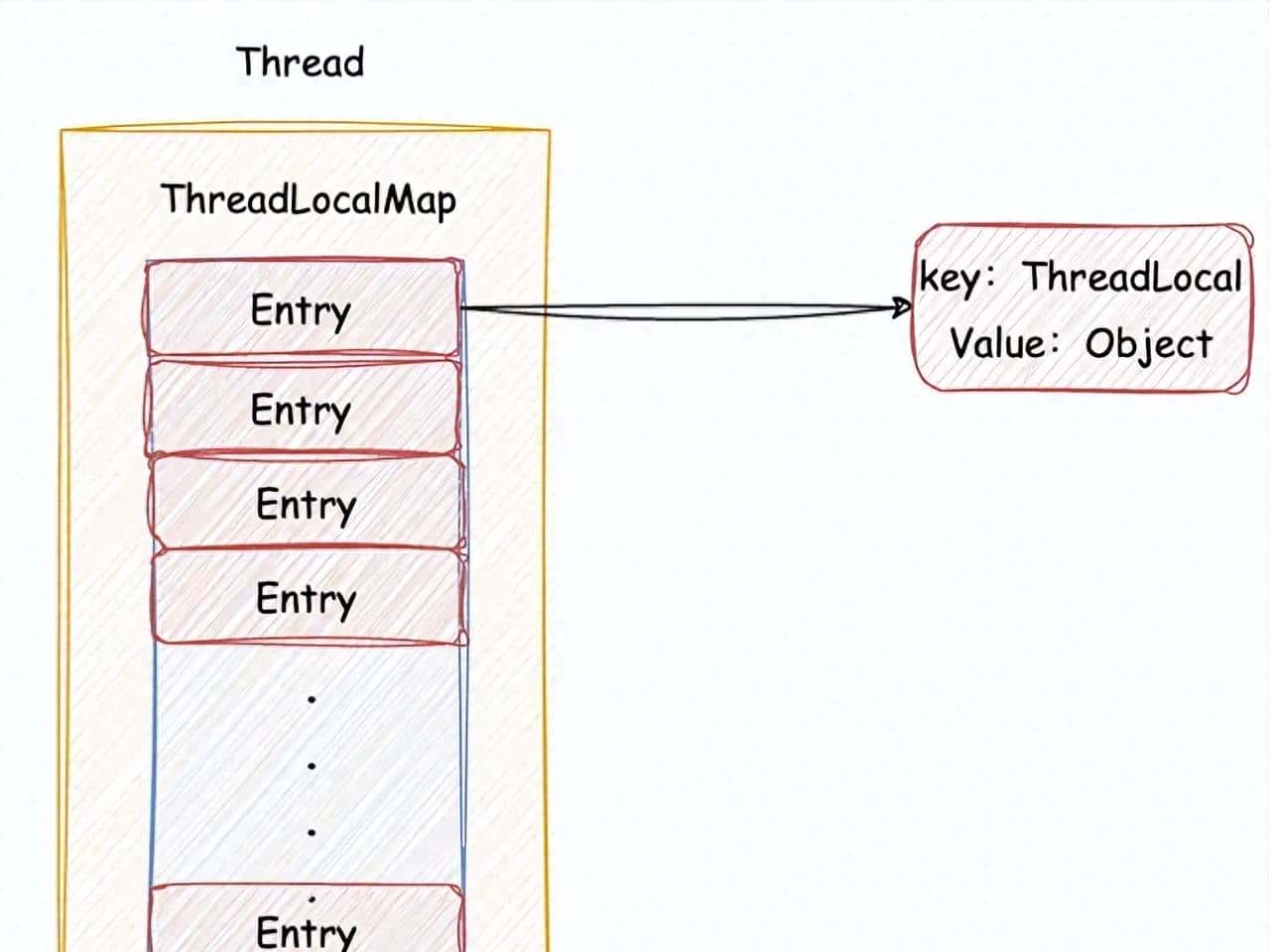 ThreadLoalMap中初始化了一个「大小16的Entry数组」,Entry对象用来保存每一个key-value键值对。key是ThreadLocal对象。