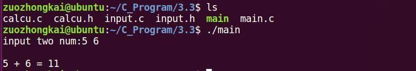 上面命令的意思就是使用gcc 编译器对 main.c、calcu.c 和 input.c 这三个文件进行编译,编译生成的可执行文件叫做 main。编译完成后来执行 main 这个程序,测试一下软件是否工作正常,结果如图所示: