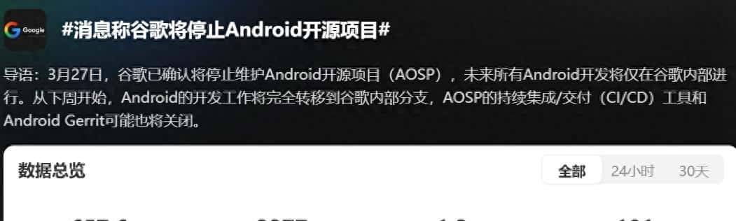 前几天有多家媒体报道称,谷歌将停止维护Android开源项目(AOSP),未来所有Android开发将仅在谷歌内部进行,也只有谷歌内部员工才能访问AOSP的内部分支或提交代码,Android的开发过程将不再对外透明。