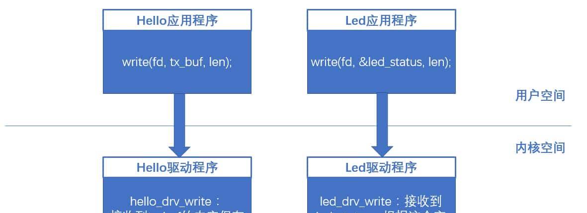 回顾hello驱动程序,我们的根据实际需求对其进行写字符串与读字符串操作。这里我们当然也要根据实际来思考我们的LED驱动程序。在STM32点灯的时候,一般输出低电平点灯,输出高电平灭灯。在嵌入Linux操作系统的情况下,我们自然也要想到有个写1/0的思想。类比我们上一篇的hello程序: