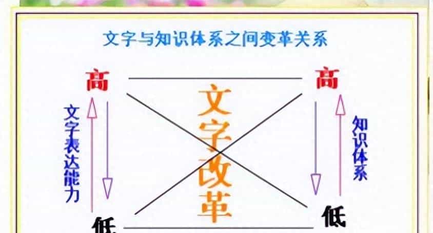 显而易见,文字改革的四象性,是由知识体系的先进性与落后性的变化过程,与文字对一般知识的表达能力的高与低形成的关联关系所确定的。不同时代的文字改革存在不同的高低知 识体系认识,存在不同的文字表达能力高低。