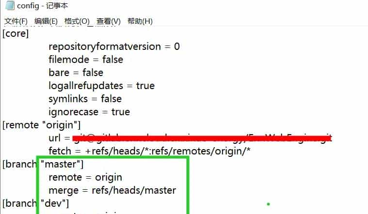 1、.git文件夹中的config文件(红色部分更改),绿色部分为分支