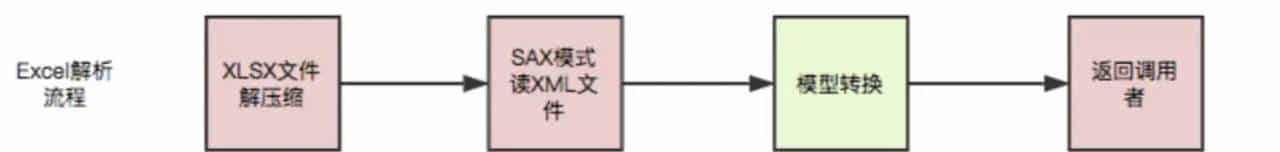 与POI 不用的是,EasyExcel主要是采用sax模式一行一行解析,并将一行的解析结果以观察者的模式通知处理,即使数据量较大时也不会发生OOM,以下是其执行流程图