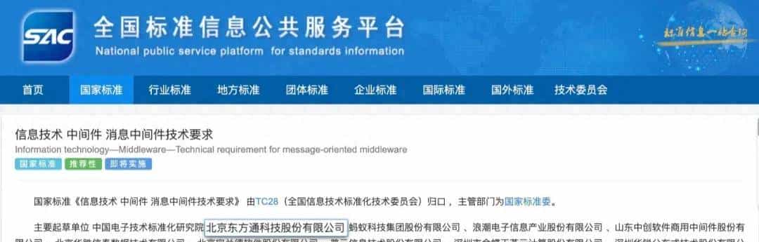 近日,国家市场监督管理总局、国家标准化管理委员会发布中华人民共和国国家标准公告(2025年第10号),GB/T 28168-2025《信息技术 中间件 消息中间件技术要求》与GB/T 26232-2025《信息技术 中间件 应用服务器中间件技术要求》两项国家标准正式发布,并将于2025年11月1日正式实施。作为核心牵头单位,东方通依托在中间件领域的深厚技术积累与行业经验,成功完成这两项中间件国家标准的编制任务,为中间件行业的有序发展提供坚实的标准化保障。