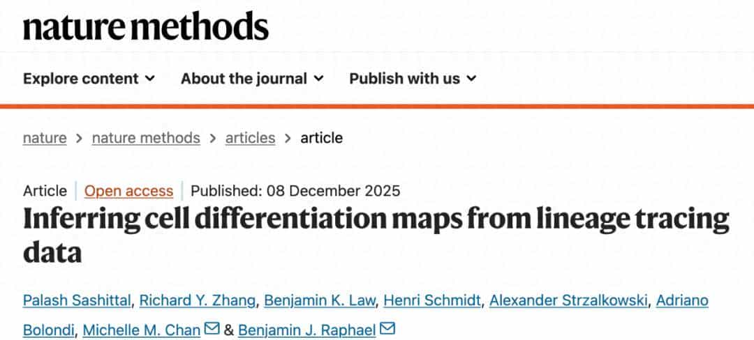 Sashittal P, Zhang RY, Law BK, Schmidt H, Strzalkowski A, Bolondi A, Chan MM, Raphael BJ. Inferring cell differentiation maps from lineage tracing data. Nat Methods. 2025 Dec 8. doi: 10.1038/s41592-025-02903-z. Epub ahead of print. PMID: 41360958.