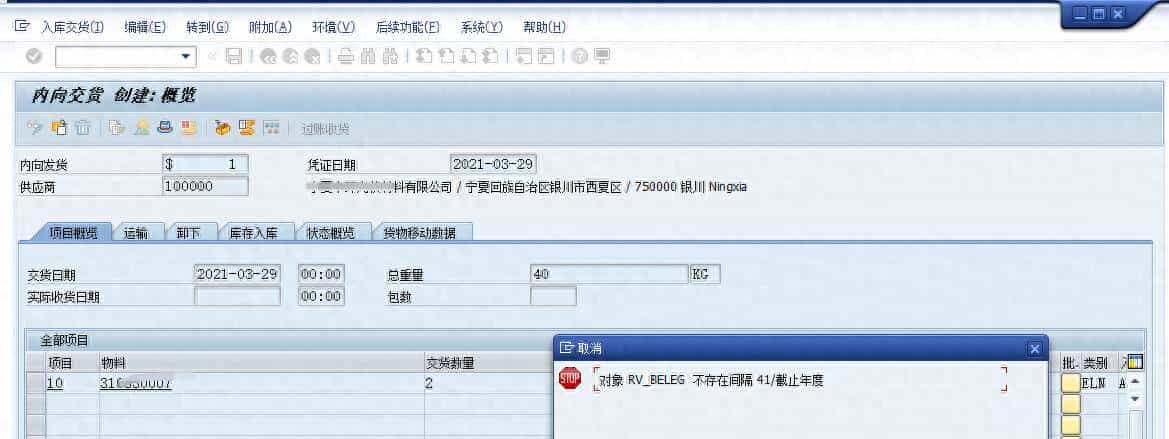SAP 创建内向交货单提示:对象 RV_BELEG 不存在间隔 41/截止年度