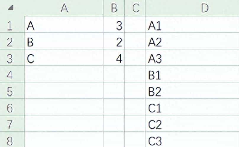 数据源(a1:b3)和结果(d1:d9)