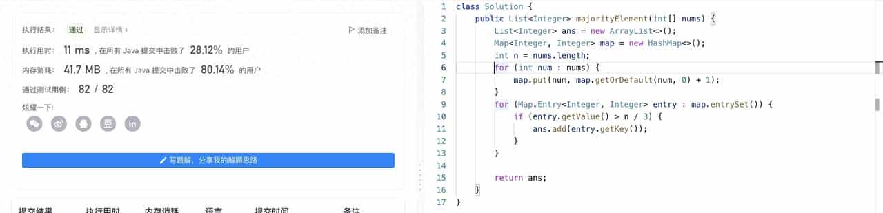 - 今天的算法每日一题是求众数,题目定义的众数是超过 n/3 次数的为众数。第一,我们可以遍历一遍 nums ,求出每个 num 出现的次数,然后用 hashMap 记录。在遍历一次 hashMap, 就可以得出题目要求的众数。实现代码如下: