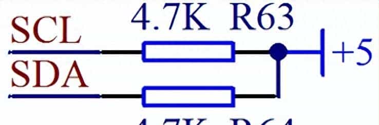 在硬件上,I2C总线是由时钟总线SCL和数据总线SDA两条线构成,连接到总线上的所有器件的SCL都连到一起,所有SDA都连到一起。I2C总线是开漏引脚并联的结构,因此外部要添加上拉电阻。开漏电路外部加上拉电阻,就组成了线“与”的关系。总线上线“与”的关系就是说,所有接入的器件保持高电平,这条线才是高电平,而任何一个器件输出一个低电平,那这条线就会保持低电平,因此可以做到任何一个器件都可以拉低电平,也就是任何一个器件都可以作为主机,如图12-1所示,添加了R63和R64两个上拉电阻。