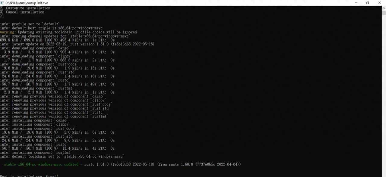 注:安装后按照提示配置环境变量,配置重启终端来检测(rustc -V)环境变量是否配置成功