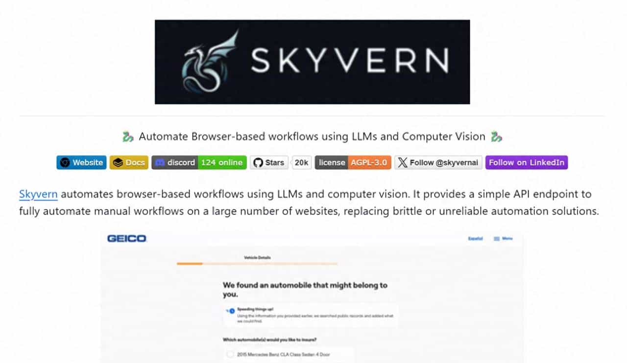 Skyvern 是由 Skyvern-AI 团队开发的开源浏览器自动化项目,项目代码托管于 GitHub(