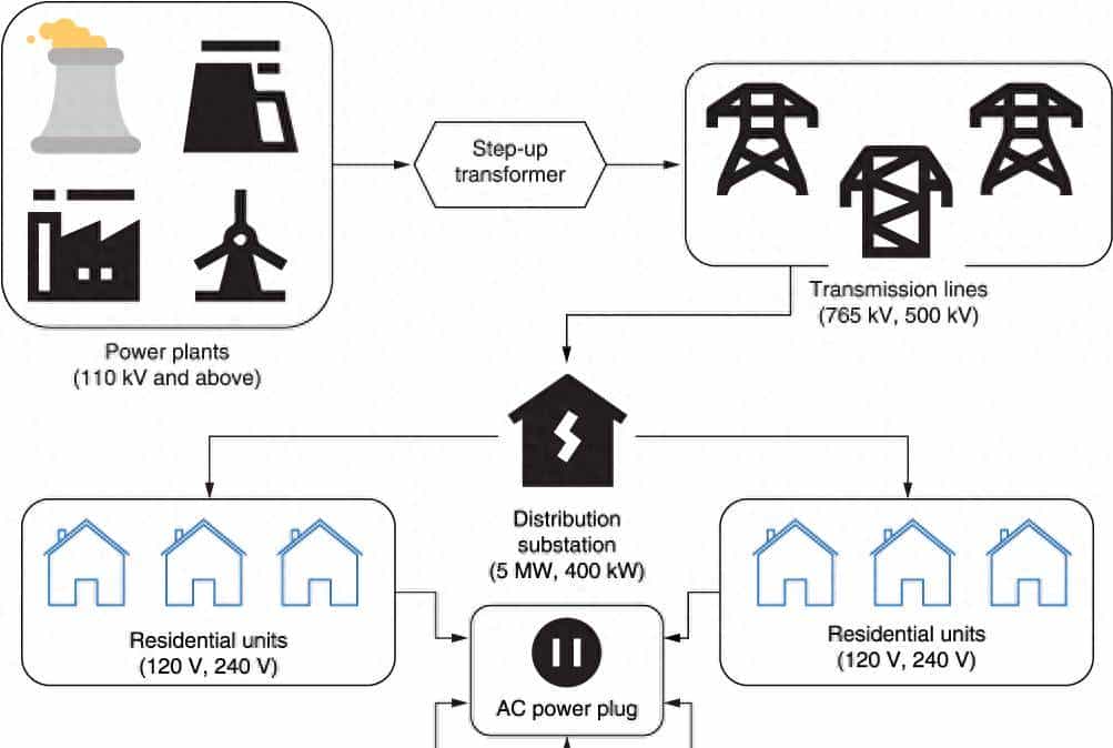 图1.1显示了形成电网的主要组成部分:一个互连的网络,用于从生产者向住宅消费者发电、传输和输送电力。正如我们所看到的,每个组件都以不同的方式处理电力,并使用各种“协议”和“适配器”(电缆线、变压器等)与其他组件进行通信,最终目标是将其带到人们的家中。当住宅单元连接到电网时,家用电器(电视机、烤箱、冰箱等)可以通过安全、受保护、易于使用的接口(交流电源插头)使用电力。如果我们思考这些插座的工作原理,我们可以很容易地理解它们在多大程度上简化了底层电网的技术方面。家用电器不必知道这样的系统是如何工作的,只要它们能够处理接口。