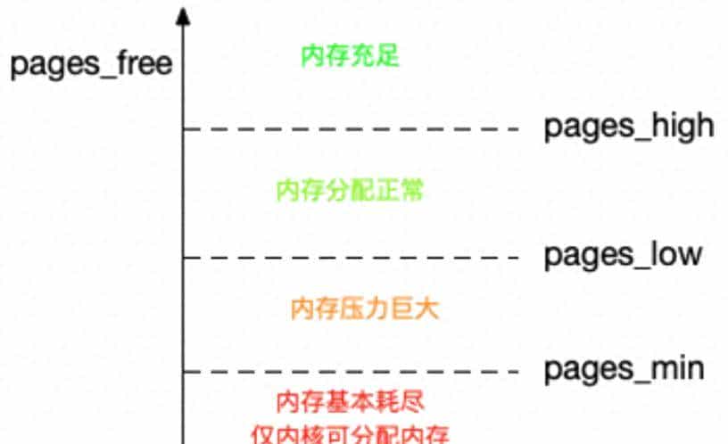 - 剩余内存落在页低阈值和页高阈值中间,说明内存有必定压力,但还可以满足新内存请求