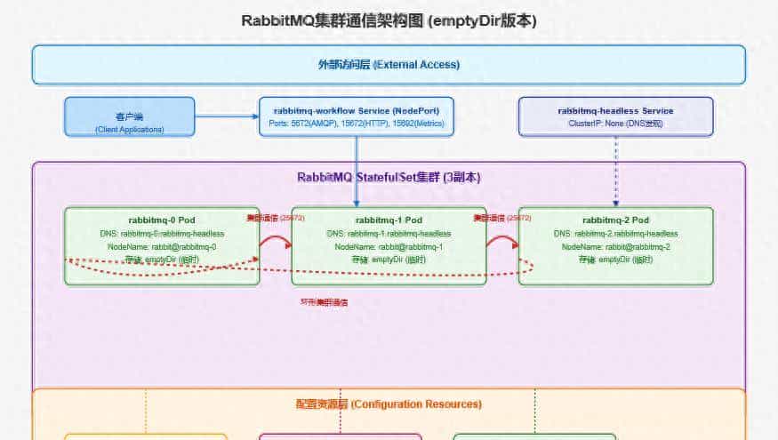 本文档详细介绍了如何在Kubernetes环境中部署高可用的RabbitMQ集群。该部署方案使用StatefulSet确保Pod的有序部署和稳定网络标识,通过Headless Service实现集群节点间的自动发现,并采用emptyDir临时存储用于测试和调试环境。