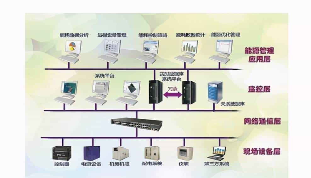 现场设备层: 指分布于高低压配电柜中的测控保护装置、仪表、以及楼宇自控、门禁、智能空调、 ups、电梯、变配电、消防等子系统。