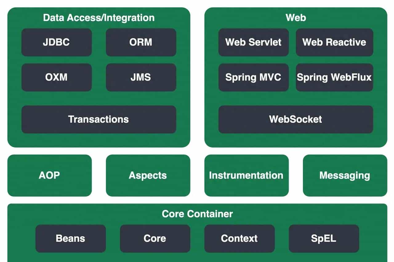 - Spring Framework(Core):Spring项目的核心。Spring Framework中包含了一系列的IoC容器的设计,提供了依赖反转模式的实现。同时,还集成了AOP功能,包含了其他Spring的基本模块,如MVC,JDBC,事务处理模块的实现。