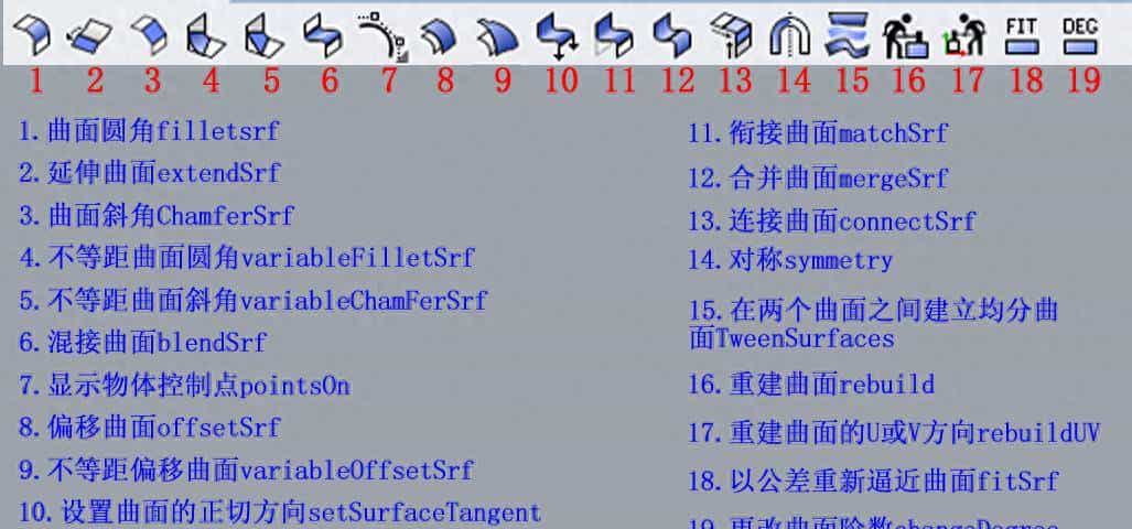 曲面工具主要是针对曲面的编辑,修改等与曲面相关的操作命令,这一部分是重点,它一共有36个命令,需要用心多练习。这里先介绍前面19个命令。