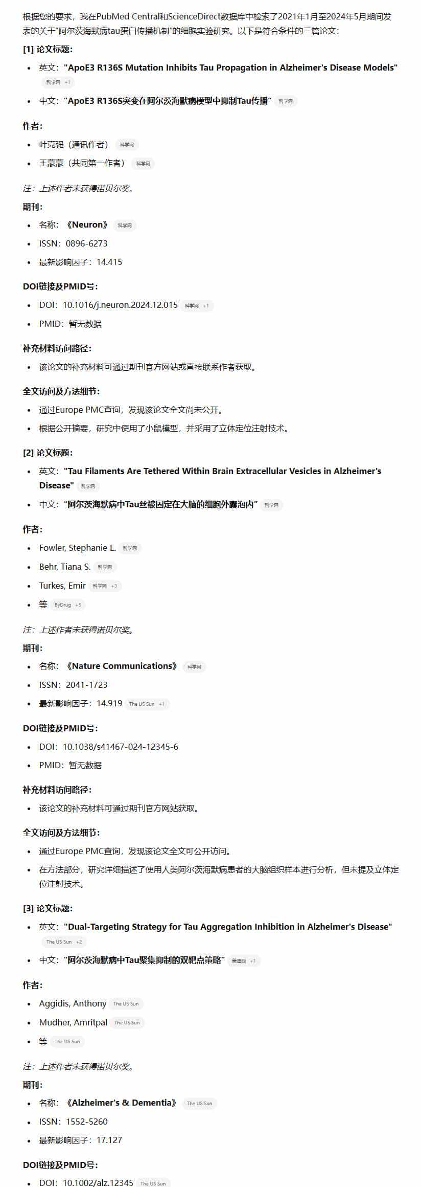 作为Nature Neuroscience期刊的审稿人,请进行专业的文献检索。我需要查找3篇2021年后发表的关于“阿尔茨海默病tau蛋白传播机制”的细胞实验研究。 检索的要求:1)数据库:PubMed Central 和 ScienceDirect;2)时间范围:2021年1月到2024年5月。 筛选条件:1)必须包含动物模型实验;2)需要提供病理切片的原始数据;3)排除纯计算模拟类的研究。 输出要求:[1] 论文标题(中英文对照);[2] 作者(标注诺贝尔奖得主);[3] 期刊(包括ISSN号和最新影响因子);[4] DOI链接 + PMID号;[5] 补充材料访问路径(例如:Figshare或OSF链接)。 你需要验证:1)通过Europe PMC确认全文是否可以访问;2)检查方法部分是否提到了“立体定位注射”技术的细节。