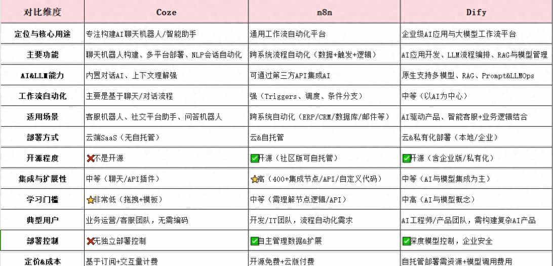 Coze、n8n和Dify均为主流的工作流/AI应用搭建平台,但核心定位与技术特性差异显著,适用场景各有侧重。参考以下表格,协助精准匹配业务需求: