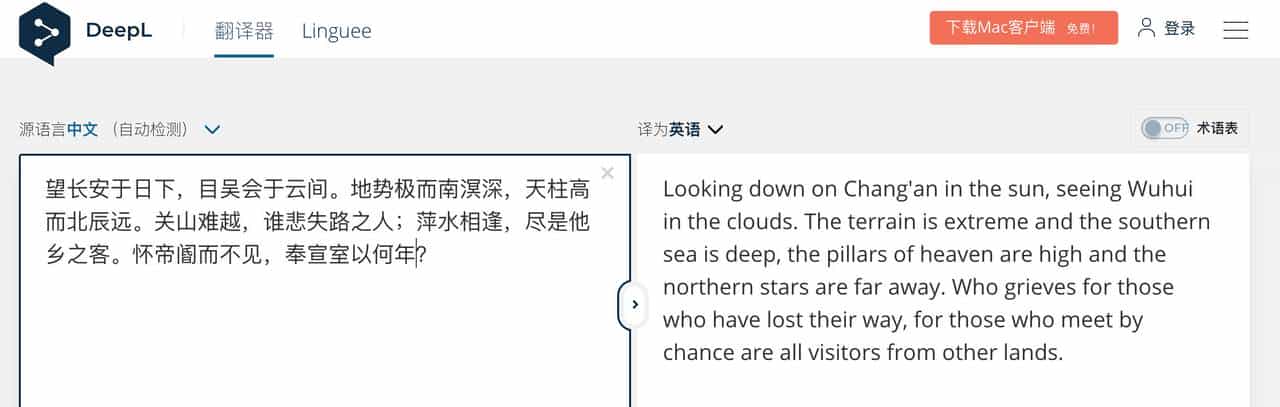 DeepL 由于其过于强劲的翻译效果,去年在推特上火了一把,相比谷歌翻译的机翻,它可以将一段文字翻译到尽可能的通顺和便于理解,甚至是俚语、方言、名言名句、古诗词等内容都可以几乎没有任何语病的翻译出来,让体验过的用户都直呼**!