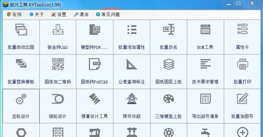 凯元工具(KYTool)是一款SolidWorks插件,主要包括批量自动出图、批量处理属性、钣金批量导CAD、导出各种BOM、设计齿轮链轮、标准件库等30多个功能,使用凯元插件可以有效提高SolidWorks设计师的工作效率。