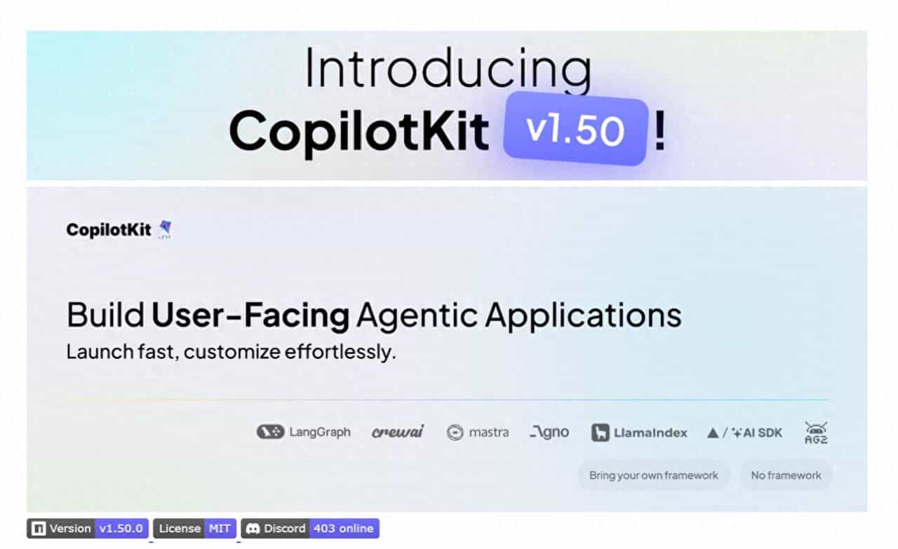 CopilotKit 的核心特性极具竞争力:其一,极速集成能力,通过 CLI 命令可快速初始化项目,无需复杂配置即可启动;其二,框架无关性,完美兼容 React、Next.js、AGUI 等主流前端框架,适配不同技术栈需求;其三,灵活的 UI 方案,提供可完全自定义的 Headless UI 和开箱即用的预制组件,兼顾开发效率与视觉定制需求;其四,内置安全防护,具备提示注入保护功能,保障生产环境的使用安全;其五,全生态兼容,深度集成 LangGraph、CrewAI、AG2 等主流 AI 代理框架,同时支持接入各类 LLM 模型,具备极强的扩展性。