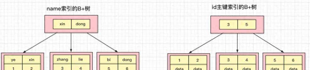 当数据库在查询上面这条sql时,先去name索引的B+树里面去找对应的字符串dong,叶子节点存储的是对应行的主键id,拿到主键id后再去id索引的B+树找那一行数据,name索引B+树和id主键B+树如下图