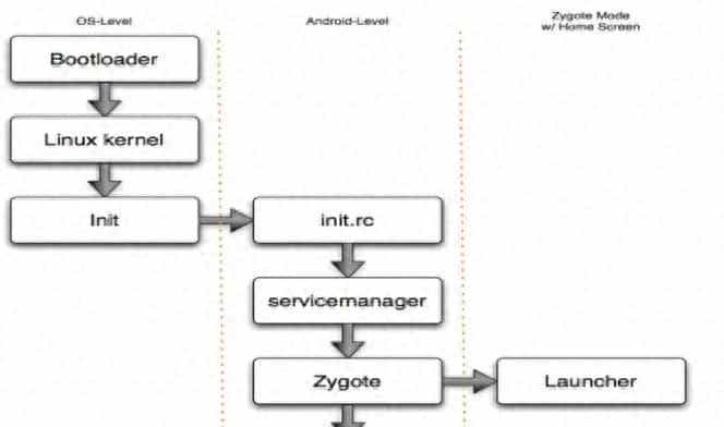 - Android-level,由init process开始,读取init.rc,Mative服务启动,并启动重大的外部程序,例如servicemanager、zygote以及system service。