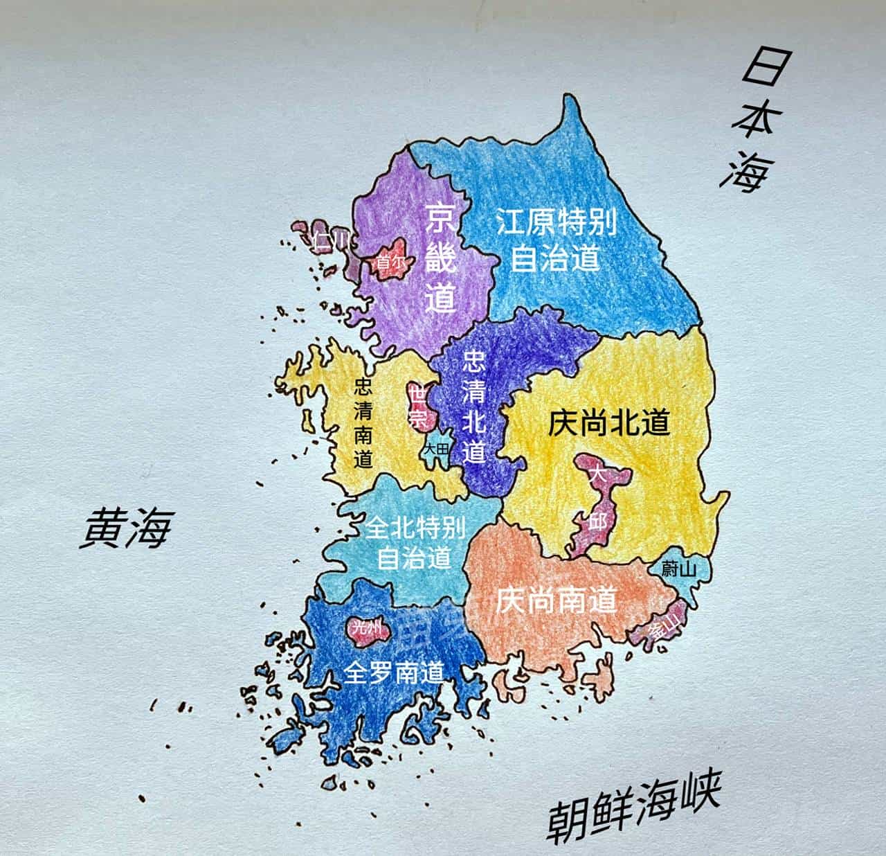 6个道—京畿道、忠清南道、忠清北道、庆尚北道、全罗南道、庆尚南道
