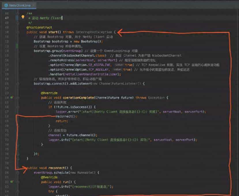 通过调用 EventLoop 提供的 #schedule(Runnable command, long delay, TimeUnit unit) 方法,实现定时逻辑。而在内部的具体逻辑,调用 NettyClient 的 #start() 方法,发起连接 Netty 服务端。