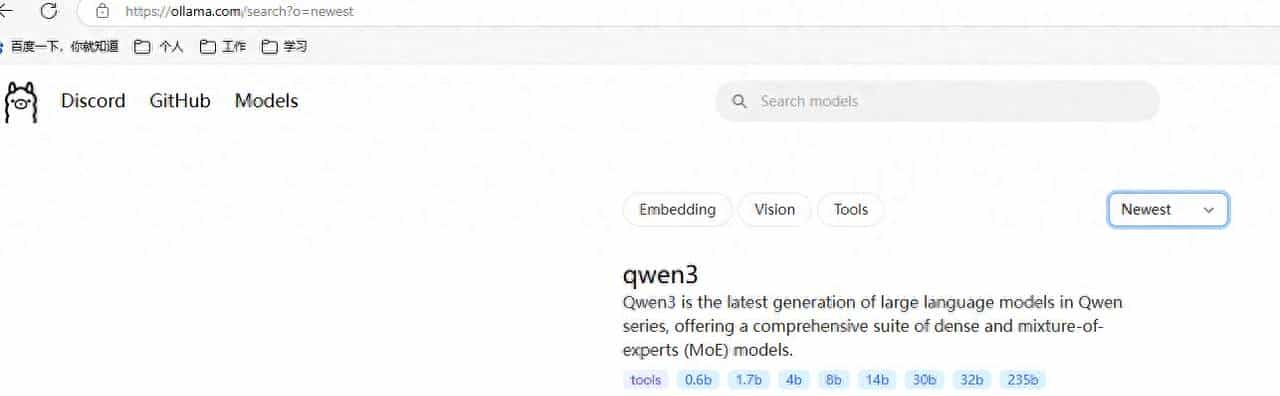 2025年4月29日凌晨,阿里巴巴开源新一代通义千问模型Qwen3(简称千问3)正式发布,采用了MOE(混合专家)和dense(稠密)两种模式,是国内首个混合推理模型,一经发布就登顶了全球最强开源模型。在https://ollama.com官网上看到也第一时间上线了这个模型,上线仅7小时,模型下载就达到了53.3K次。这必须得尝鲜部署一下。