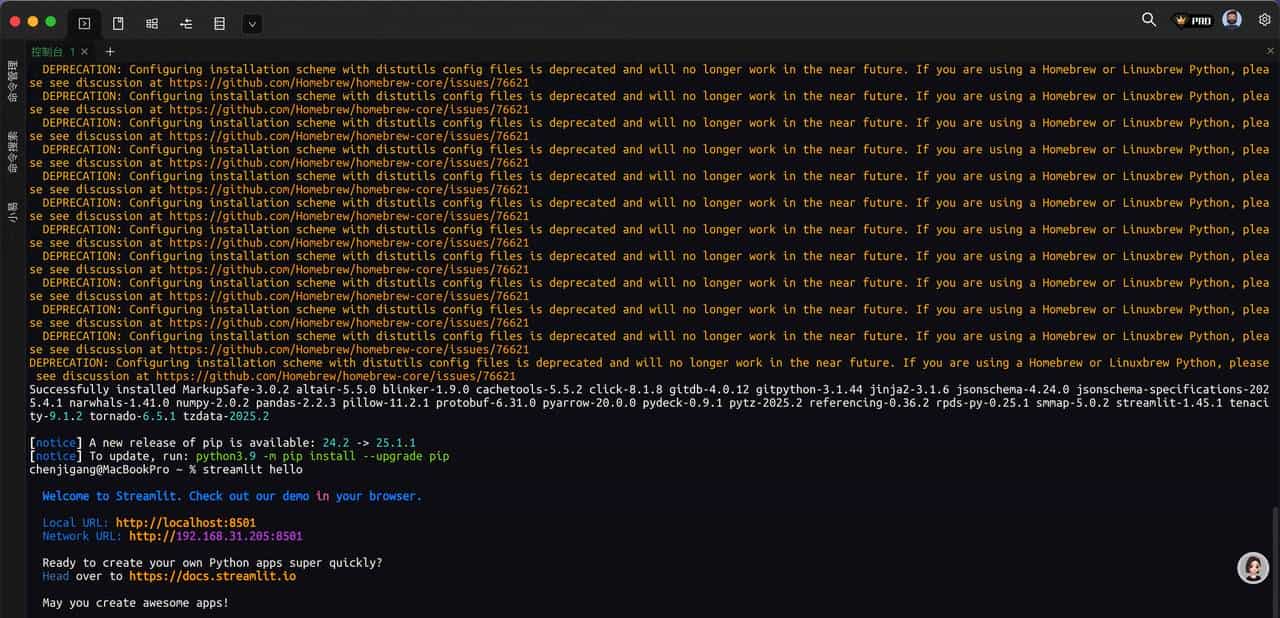 执行成功后,会给出如下提示,并自动在浏览器打开streamlit本地服务主页