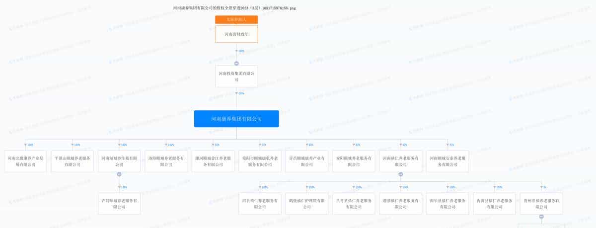 河南康养集团有限公司(以下简称“河南康养集团”),成立于2016年,现为河南省属平台河南投资集团有限公司(以下简称“河南投资集团”)的全资子公司。根据天眼查信息,河南康养集团成立之初全称为“郑州颐城乐活养老服务有限公司”,2020年8月,其股权结构变更为河南颐城控股有限公司(河南投资集团全资子公司)100%控股;2021年11月,更名为“河南颐城康养产业集团有限公司”;2022年初,从颐城控股剥离,由河南投资集团孙公司变更为其子公司;2023年初,正式更名河南康养。