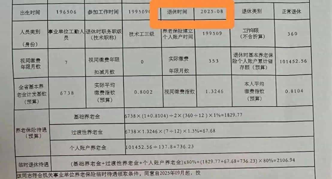 坐标河南,某事业单位工勤人员,1965年6月出生,1995年9月参与工作,1995年9月建立个人账户,2014年3月转入事业单位并停止缴费,2014年10月事业建账继续缴费,2025年8月60岁2个月时正常退休,退休时为技术工三级岗位。