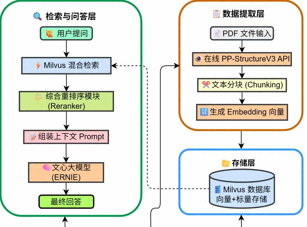 该系统集成了 在线 OCR 解析、Milvus 混合检索(向量+关键词) 以及 多维度的重排序(Reranker) 策略,可以提升低资源环境下的检索准确率,以实现高精度多文档分析与问答。