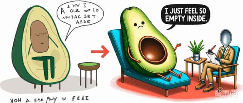 列如下图,所使用的提示词为:一个牛油果坐在治疗师的椅子上,说“我只是觉得内心很空虚”,它的身上有一个坑大小的洞。治疗师是一个勺子,正在潦草地记着笔记。