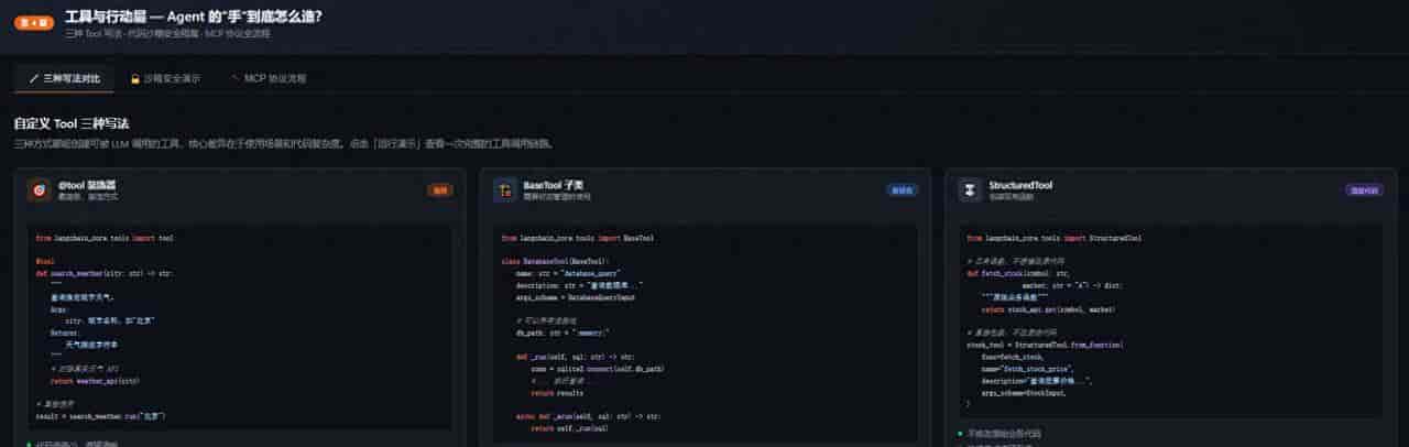 - 三种写法对比:三列并排,@tool / BaseTool / StructuredTool 代码结构动态对比,点击高亮对应代码块