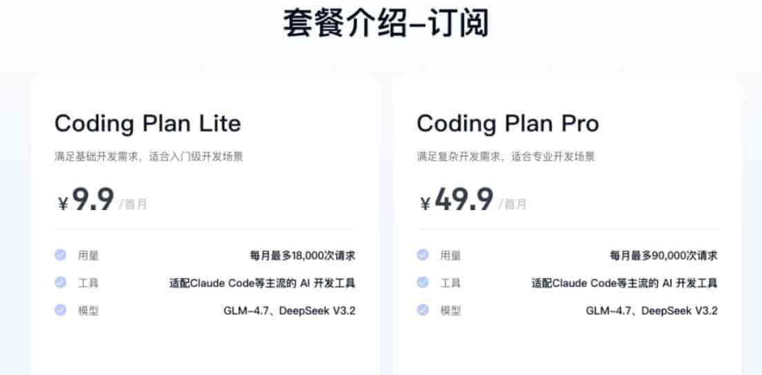 在成本方面,百度千帆Coding Plan采用清晰的订阅制,门槛较低:新用户首月仅需9.9元,可享受Lite版(最高18,000次请求);Pro版为49.9元/月,提供多达90,000次请求支持。它适合追求高性价比、需要灵活使用多模型,或开发环境不局限于某一家云服务的个人开发者及中小团队。