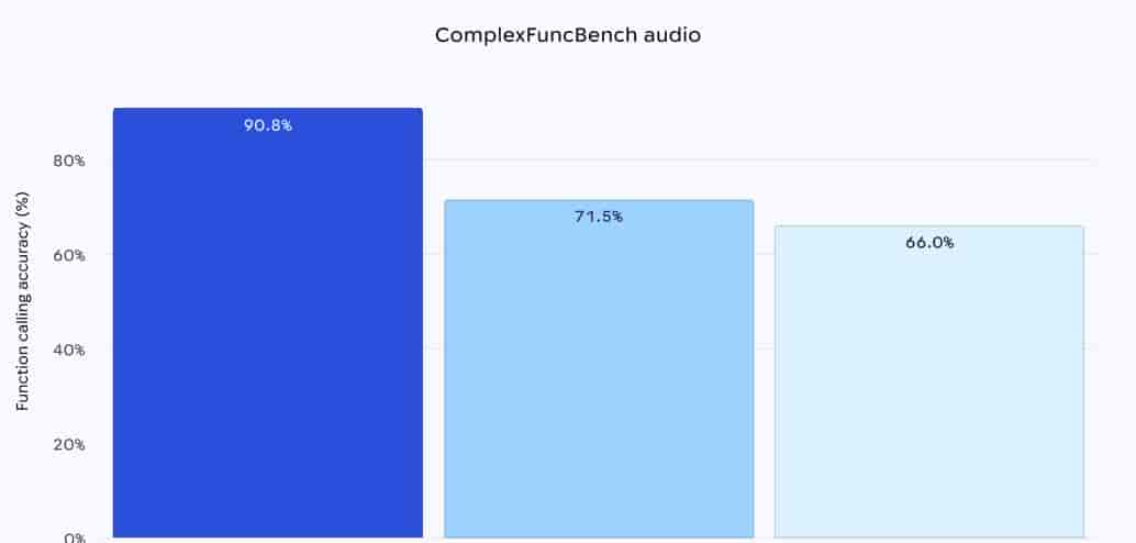 性能方面,在专用于评估包含多种约束条件的多步函数调用基准测试——ComplexFuncBench Audio中,Gemini 3.1 Flash Live取得约90.8%的成绩,远超2.5版本的前代,在多步骤语音任务理解与调用能力上表现突出。